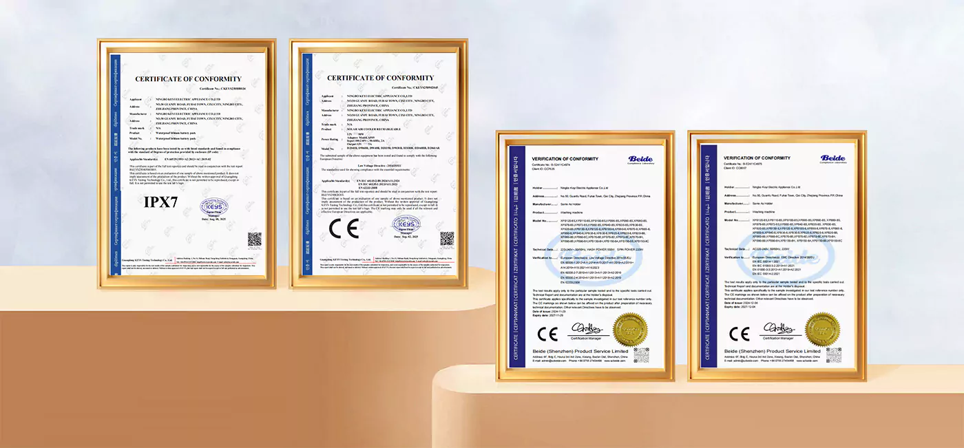 आमच्या वॉशिंग मशिन आणि एअर कूलर्सनी EU चाचणी मानके उत्तीर्ण केली आहेत आणि CE प्रमाणपत्र प्राप्त केले आहे. बॅटरीला IPX7 वॉटरप्रूफ रेटिंग आहे. आम्ही देशांतर्गत ई-कॉमर्स प्लॅटफॉर्म आणि अलीबाबावर उत्कृष्ट विक्रेता म्हणून देखील प्रमाणित आहोत.